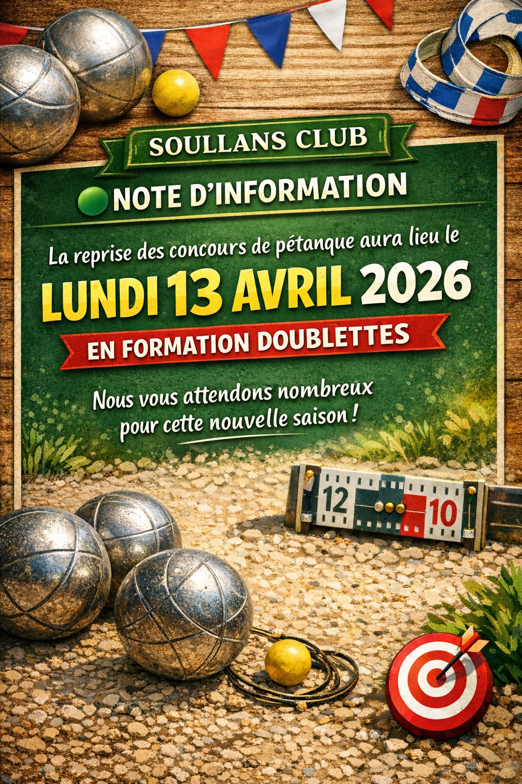 La reprise des concours de pétanque aura lieu le lundi 13 avril 2026, en formation doublettes.
